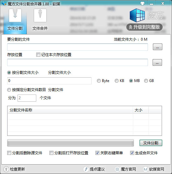魔方文件分割合并器是一款小巧易用的文件分割合并工具,它的操作非常简单,用户只需设定好自己需要的规格,如大小、数目、名称等设置好之后选择需要分割的文件即可轻松完成分割操作。使用魔方文件分割合并器进行合并操作也非常简单,用户只需选择被分割的文件然后选择存放位置即可合并被分割的文件。平时需要对文件进行分割合并操作的朋友可以试一试。