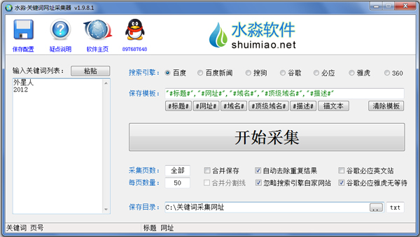 水淼关键词网址采集器能够根据关键词搜索百度、360、搜狗、谷歌等,采集搜索结果的网址和标题输出保存。