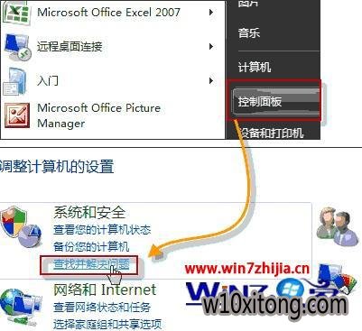 1、首先打开开始菜单中的控制面板,然后在控制面板中选择“系统总裁专业版系统和安全”下的“查找并解决问题”项;