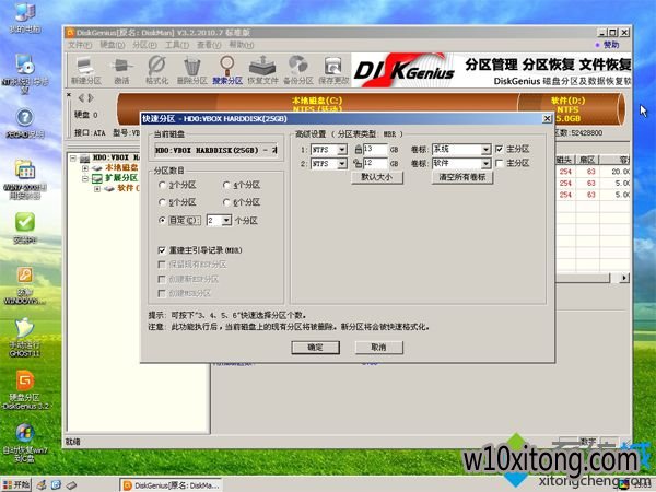4、弹出这个窗口,设置分区数目和大小,系统盘一般建议30G以上,点击确定执行分区操作;