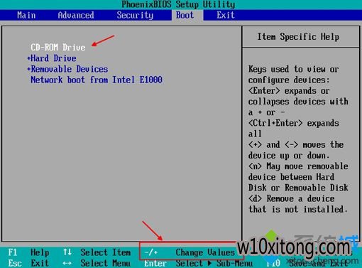 4、选择CDROM回车,有些主板需按F5或PageUp或加号将CD/DVD移动到第一位;